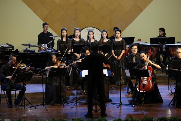 全场音乐会的乐曲有诗意,有越韵,有现代音乐词汇彼此相交融。作曲家丁樱的《剡水曲》,探索中国音乐的张力表现,虚实之变、动静之变、清浊之变,有着强烈深沉的音乐表现;青年作曲家景新的《神隐西罨居》,则运用了浙江仙居童谣的音乐素材,用西洋管弦乐与中国拉弦乐器、弹拨乐器共同演绎。这种新颖的音响与结构有着当代年轻作曲家的表达方式,不同乐器在乐曲进行中流淌、静止,而又互相编织。