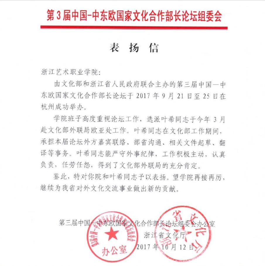 近日,第三届中国—中东欧国家文化合作部长论坛组委会办公室、浙江省文化厅给浙江艺术职业学院发来函件,表彰我校在文化部与浙江省人民政府联合主办的第三届中国—中东欧国家文化合作部长论坛期间为浙江省对外文化交流事业所作出的贡献,并表扬我校继续教育学院叶希所付出的努力。