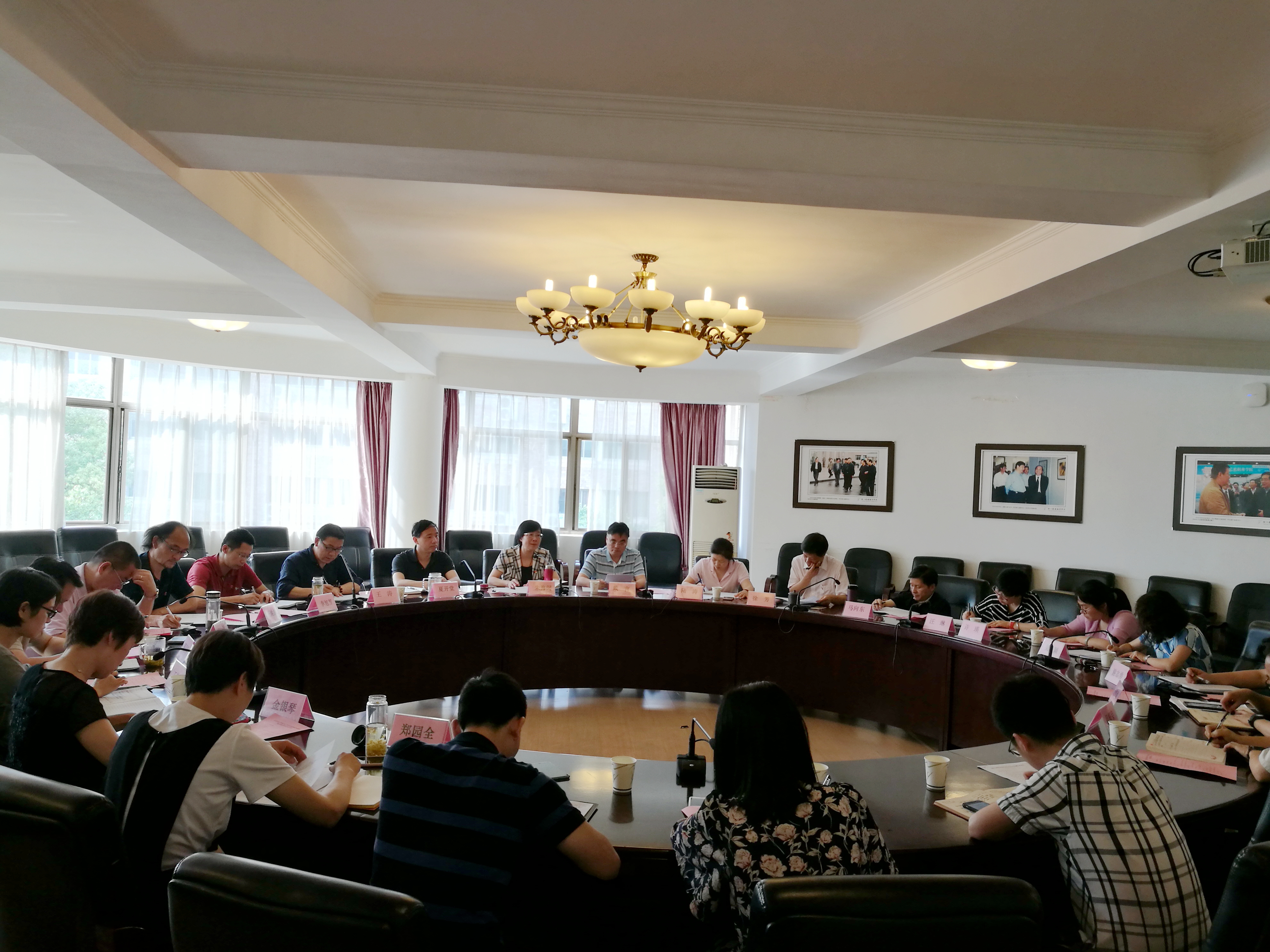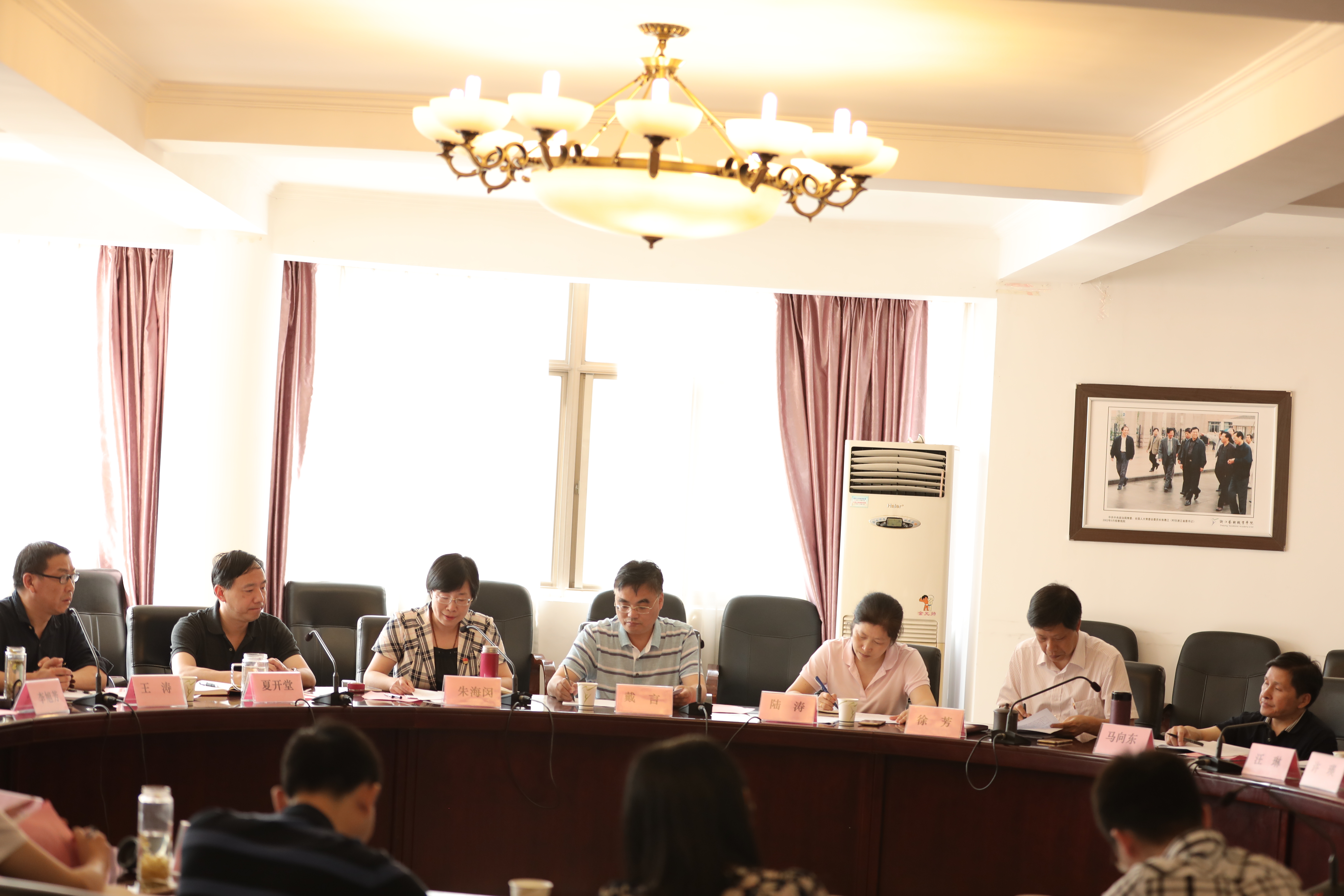 6月13日下午,省文化厅直属机关党委委员、厅人事处处长戴言,调研员陆涛一行来校督查2018年上半年党建和党风廉政建设情况。浙江艺术职业学院党委书记朱海闵,党委副书记夏开堂,党委委员、纪委书记徐芳,党委委员、组织部(统战部)部长王涛,党委委员、宣传部长马向东及党委各职能部门、各党总支负责人参加座谈。
