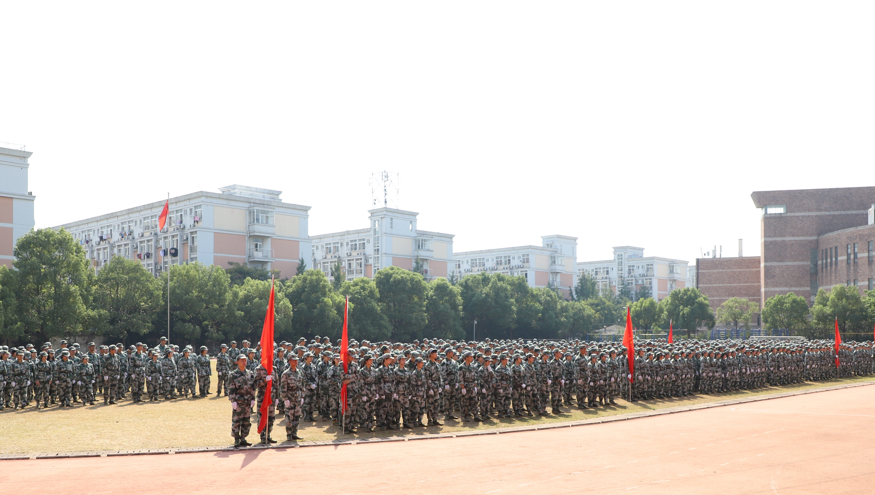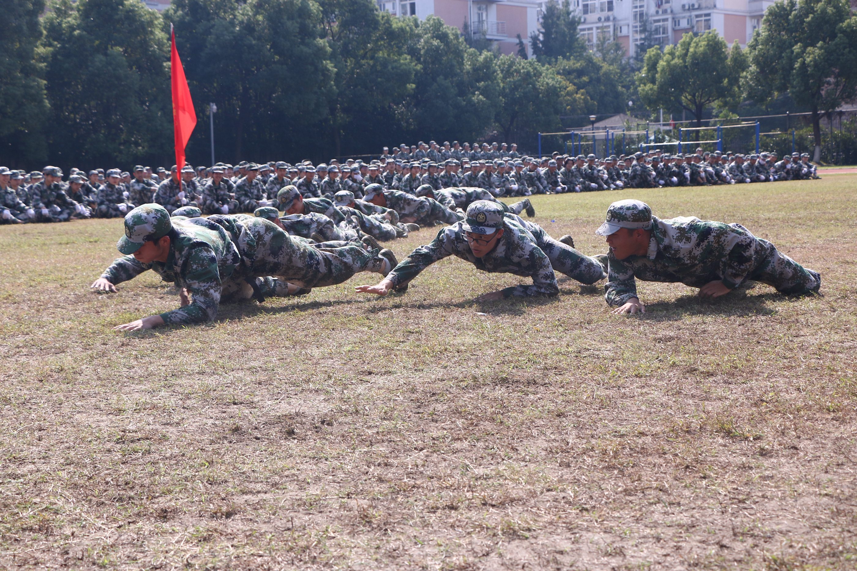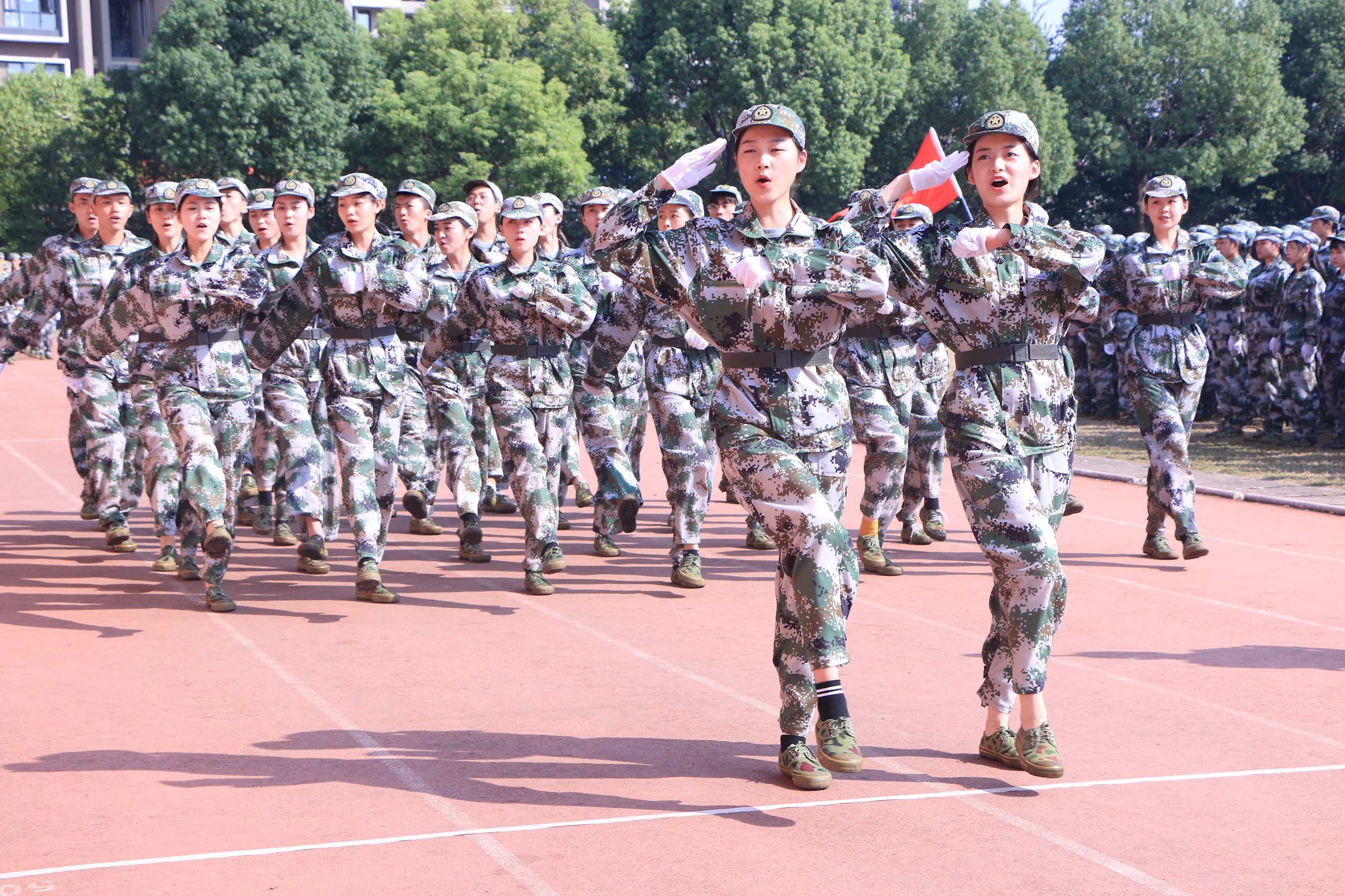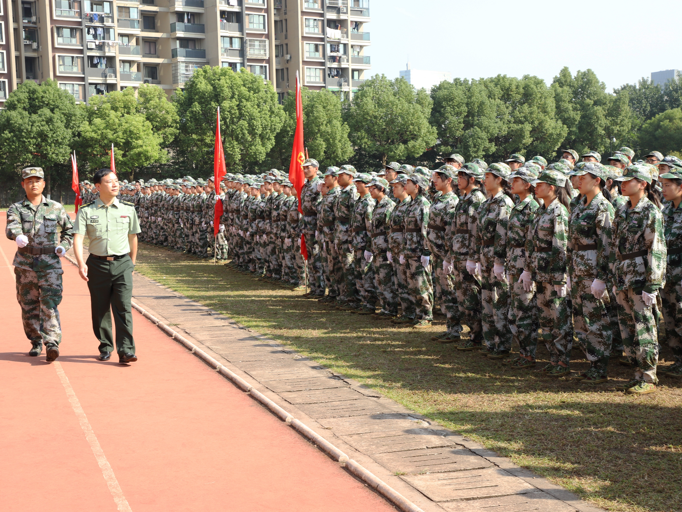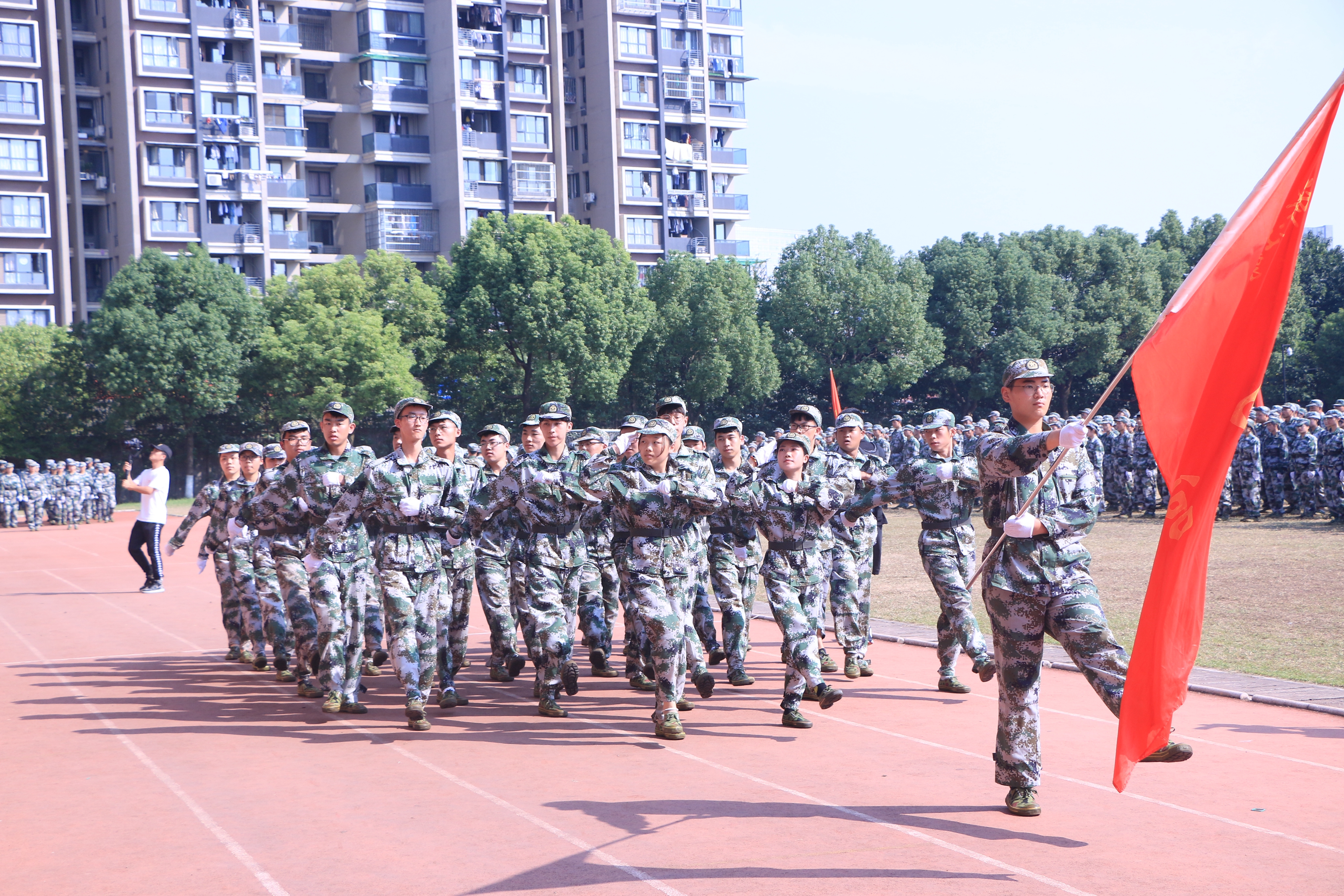 《义勇军进行曲》响起,全体新生用坚定的眼神凝望五星红旗缓缓升起,闭训仪式随即拉开大幕。党委副书记夏开堂代表学院党委检阅了新生军训队伍。各营排进行分列式军训汇报,“提高警惕,保卫祖国;扬帆把舵,奋勇拼搏,看我一排,气势磅礴;牢记担当,百炼成钢,再创辉煌……”,嘹亮的口号声在田径场上空回荡,这是发自内心的声音,响彻天空。经过军训的洗礼,同学们步伐有力、英姿昂扬,将这半月所学所练一一展现。方阵表演吸人眼球,军体拳表演、队列表演、战术表演,这支由各系最精英的成员组成的方阵,以精湛的军训动作展示,向老师和同学们致敬。