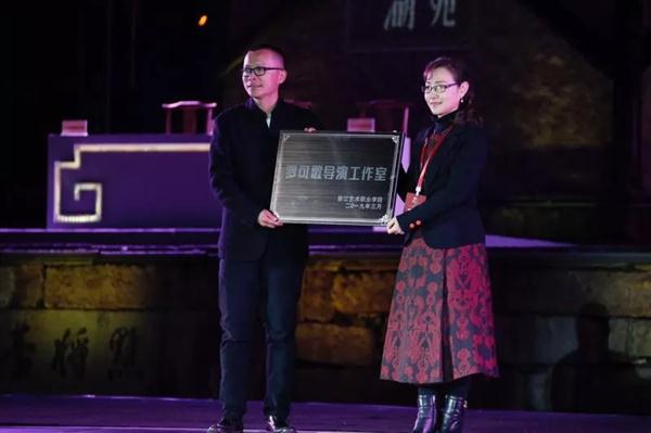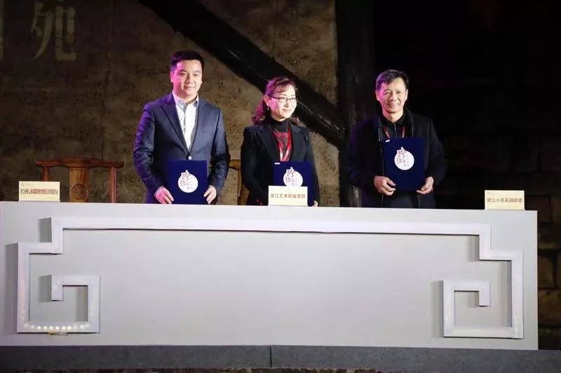 浙江艺术职业学院院长黄杭娟与浙江小百花越剧团党总支书记刘建宽、湘湖国家旅游度假区管委会副主任韩钟签约,为浙江做客文化创意有限公司“罗可歌导演工作室”授牌。