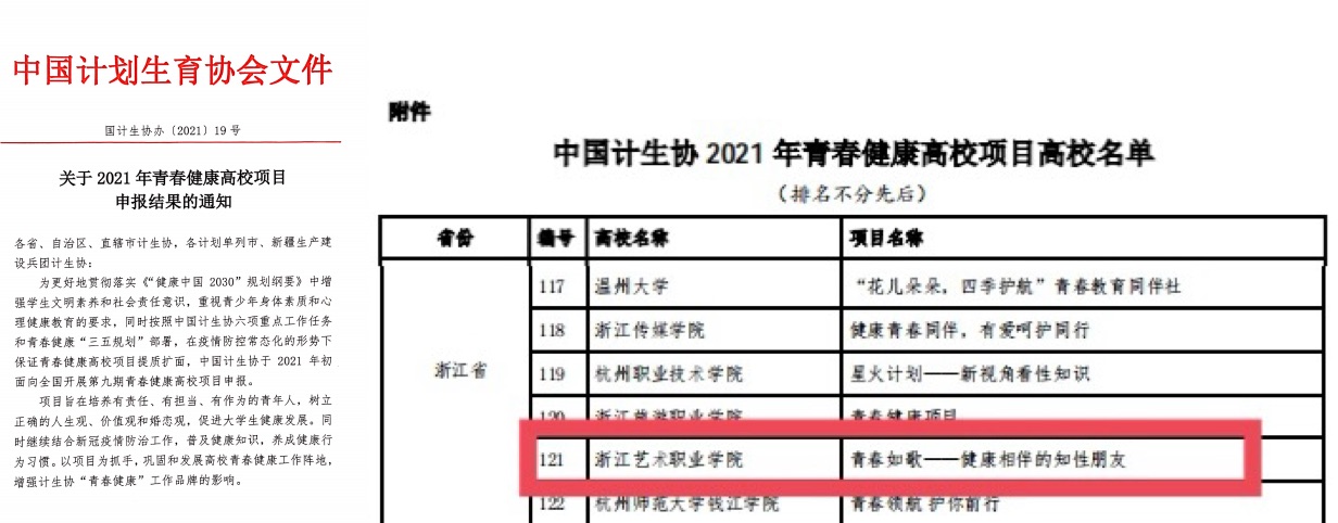 近日,中国计划生育协会发布《关于2021年青春健康高校项目申报结果的通知》,经中国计划生育协会专家评审,由我校团委指导的青春健康志愿服务项目《青春如歌——健康相伴的知性朋友》,从全国500多所高校申报项目中脱颖而出,获得国家级立项。