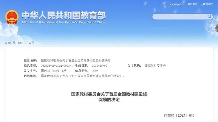 全国教材建设奖由国家教材委员会主办,教育部承办,每4年评选一次,是检阅、展示教材建设服务党和国家人才培养成果,增强教材工作者荣誉感、责任感,推动构建中国特色、世界水平教材体系的一项重大制度。这是新中国成立以来首次设立全面覆盖教材建设各领域的专门奖励项目,也是全国教材领域的最高奖。