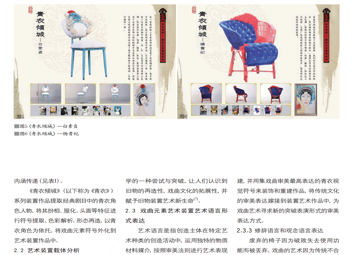 陶靓子是美术系环境艺术设计专业教师,教研室主任,其成果论文《戏曲元素在装置艺术中的形式表达》发表于《家具与室内装饰》杂志(北大核心),为浙江省教育厅2020年度高等学校国内访问学者“教师专业发展项目”《戏曲元素艺术装置创新探索》的研究成果。成果相关《青衣倾城》系列装置作品,为2019年度浙江文化艺术发展基金视觉艺术项目《戏曲元素艺术装置系列作品主题创作交流》项目其中一组作品。以青衣主题旧物改造装置艺术创作项目为例,提炼经典戏曲人物特征,将“戏曲”“符号”“艺术装置”“旧物改造”这些不同领域的元素相结合,尝试用戏曲青衣元素来改造回收的旧物,创作具有强烈装饰色彩的装置艺术作品,并在实践中分析戏曲元素艺术装置艺术语言呈现方式,探寻传统戏曲文化新艺术表达的可能性。