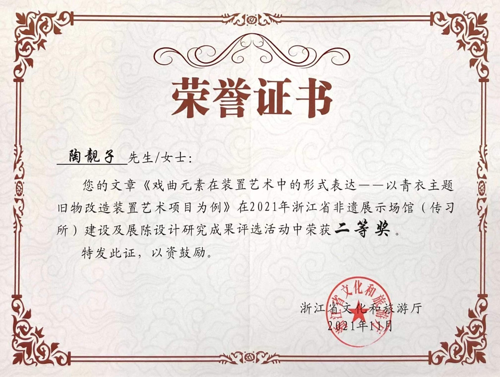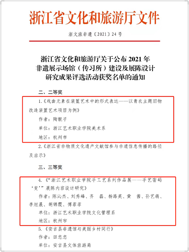 近日,浙江省文化与旅游厅公布了2021年非遗展示场馆(传习所)建设及展陈设计研究成果评选活动获奖名单,我校美术系教师陶靓子的论文《戏曲元素在装置艺术中的形式表达——以青衣主题旧物改造装置艺术项目为例》荣获二等奖,文化管理系教师陈沁杰、刘秀峰、齐磊等团队的研究成果《“浙江艺术职业学院手工艺系列作品展——手艺密码‘变’”展陈内容设计研究》喜获三等奖。