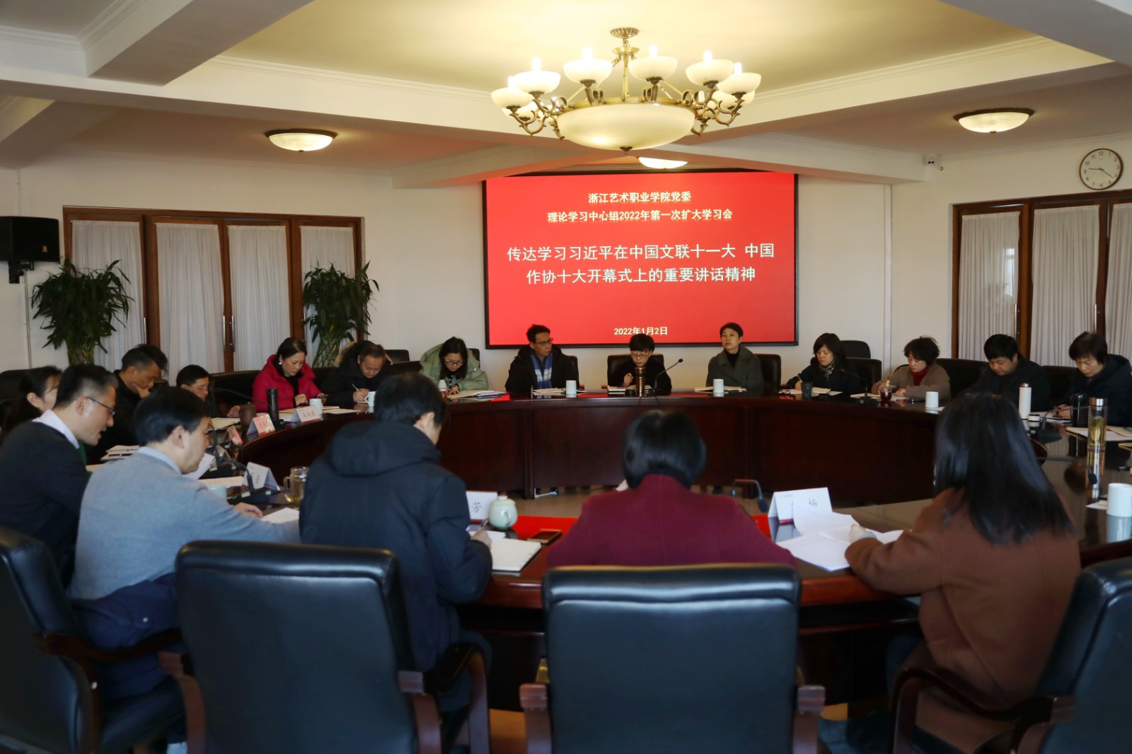 1月2日上午,浙江艺术职业学院党委理论学习中心组召开扩大学习会,集体重温和专题学习习近平总书记在中国文联十一大、中国作协十大开幕式上的重要讲话精神。校党委班子成员参加学习会。二级学院党政负责人和职能部门负责人列席学习会。校党委书记薛亮主持会议。