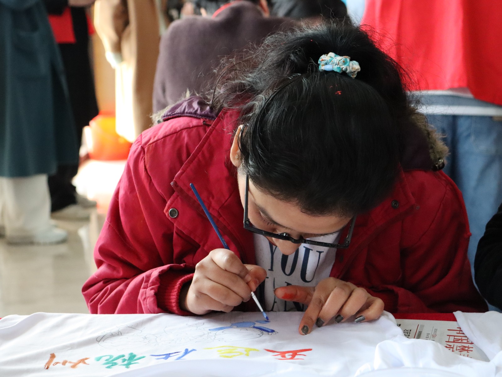 在“巾帼绘亚运”创意彩绘T恤活动中,外国友人们神情专注,精心在衣服上进行彩绘。
