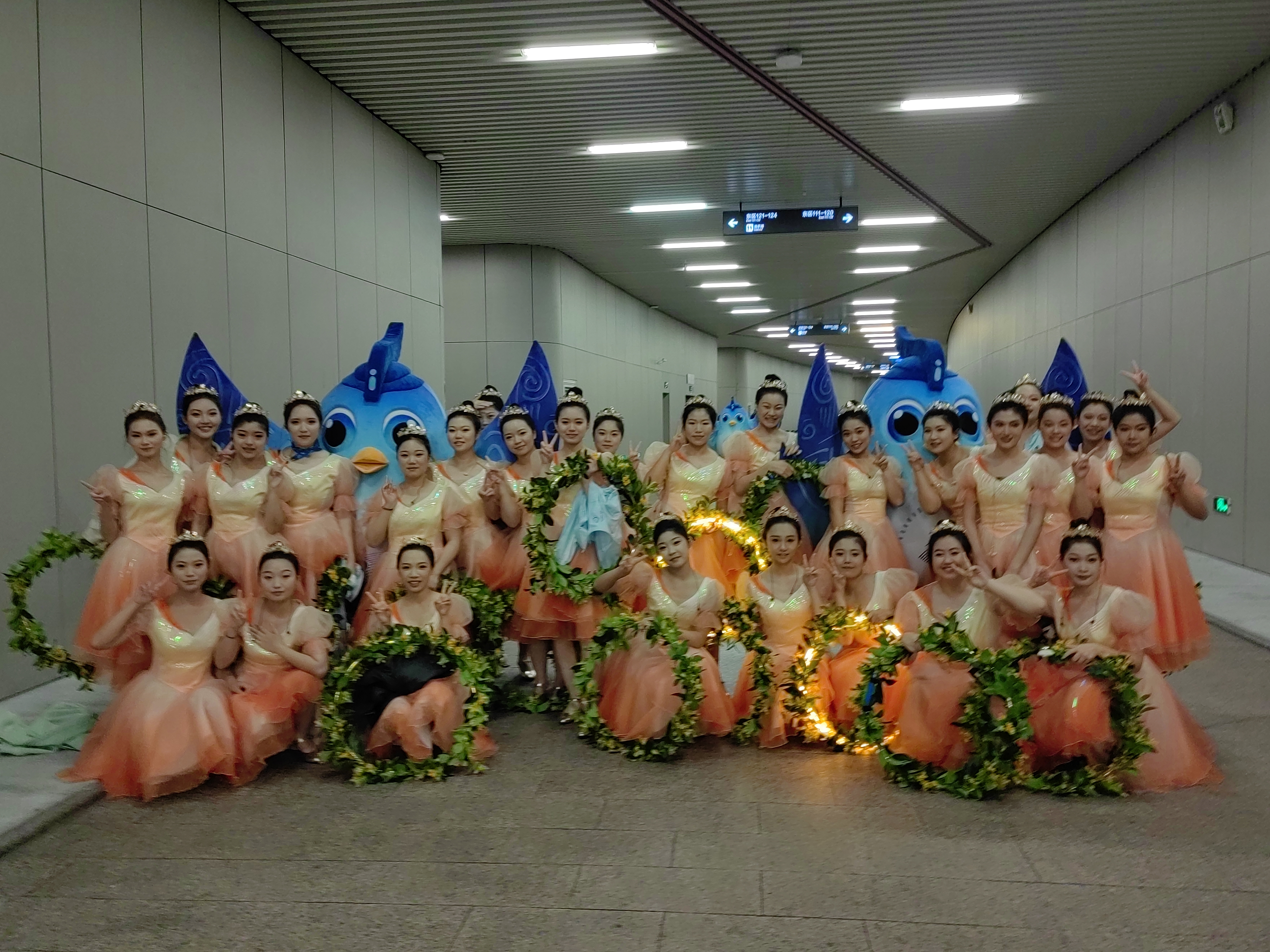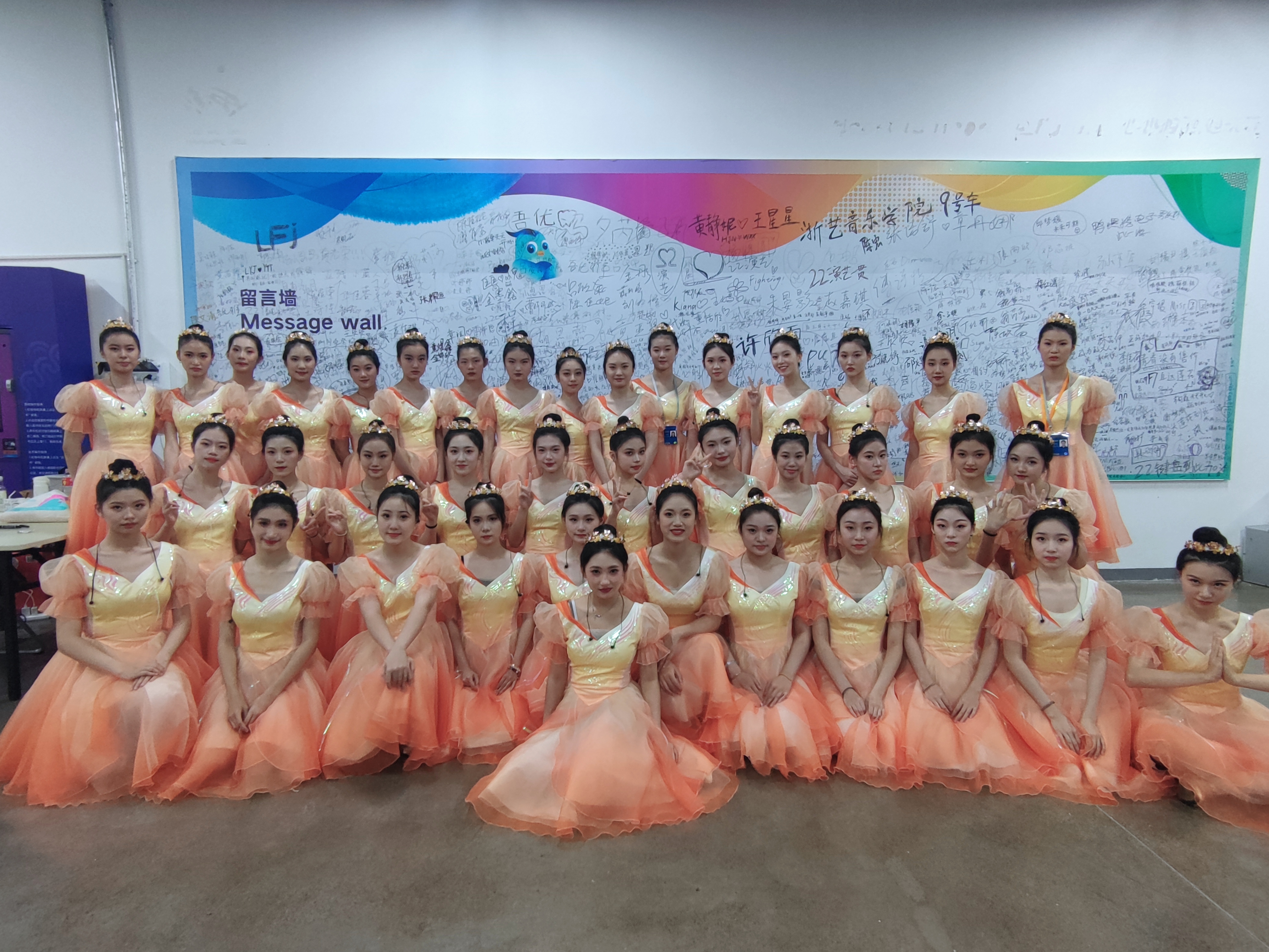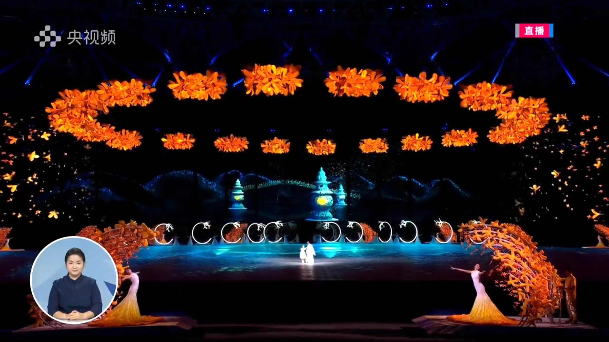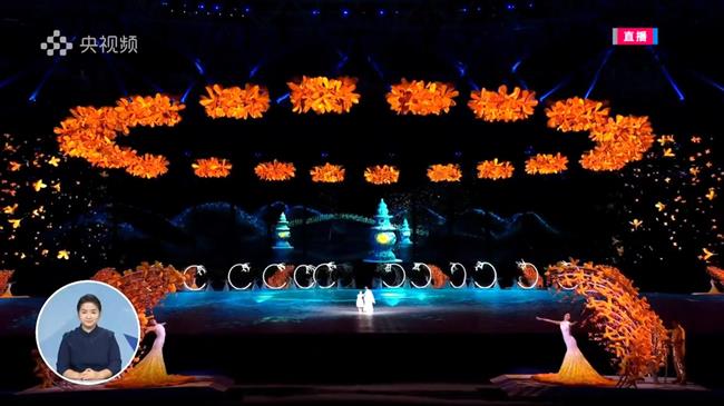 演艺与教育学院265名学生、戏剧影视学院89名学生、音乐学院32名学生手持金色花环扮演金桂少女,站在两列月亮门旁,与月亮门的皎洁形成呼应,现场的演出效果富有江南韵味。