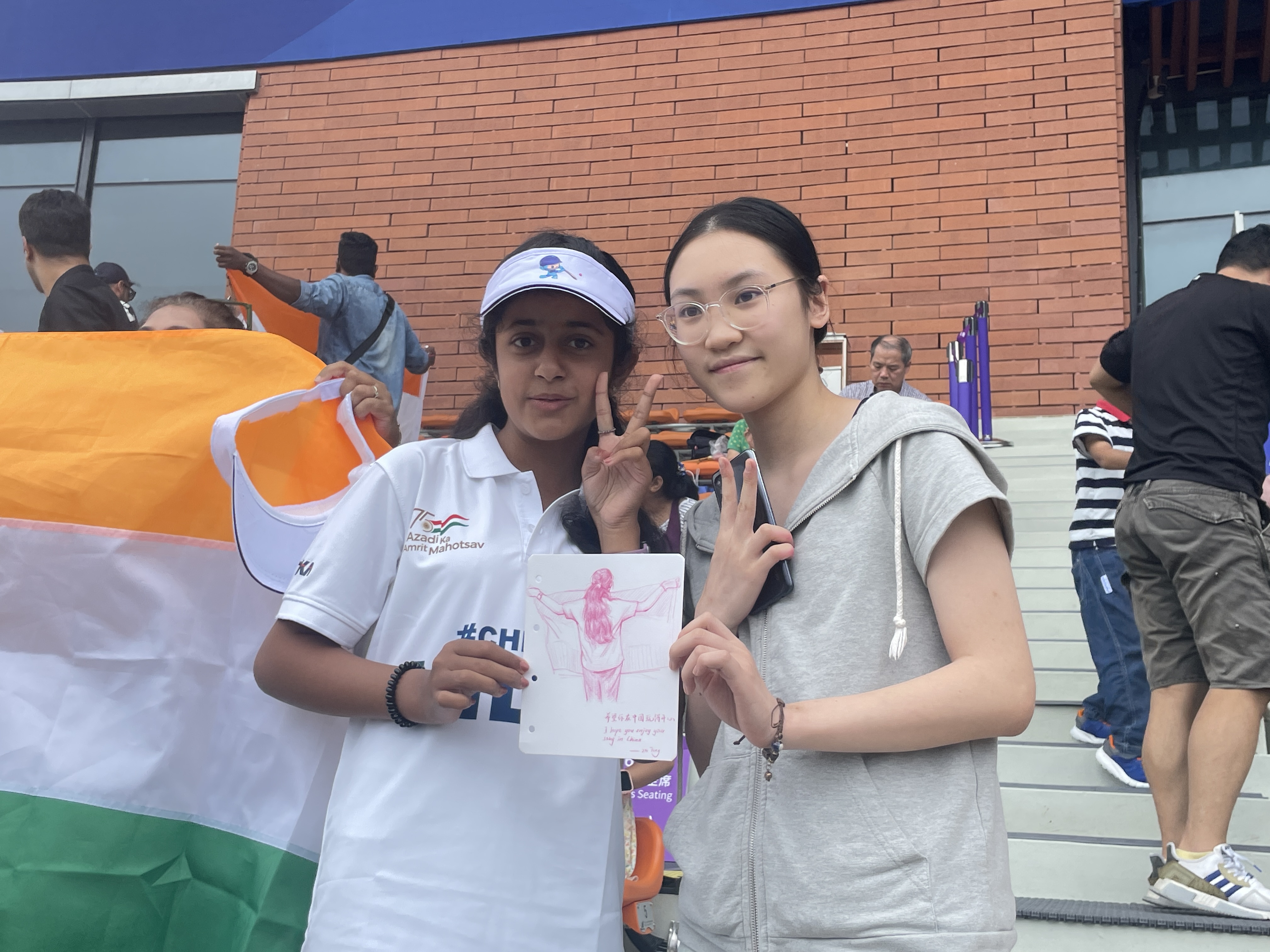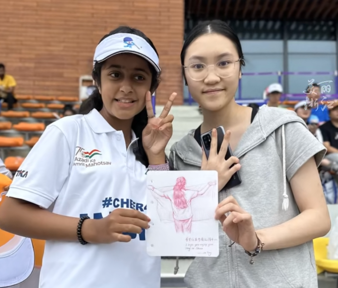 10月3日,童赵楠前往比赛现场。随着比赛的进行,她用心感受着每一个瞬间,用敏锐的观察力捕捉选手们的动作和场景,在画板上迅速描绘出比赛场景以及运动员们比赛的精彩瞬间。她的画作充满了动感和生命力,生动地展现了运动员们在赛场上的拼搏精神和团队合作精神。最后,她将一幅幅精美画作送给了外国观众,得到了他们的赞赏。