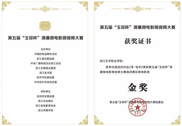 近日,第五届“玉琮杯”清廉微电影微视频大赛在杭州圆满落幕,经过激烈角逐,我校参赛作品《净·铅华》《清溪谣》分别荣获高校赛区微电影类金奖和银奖。