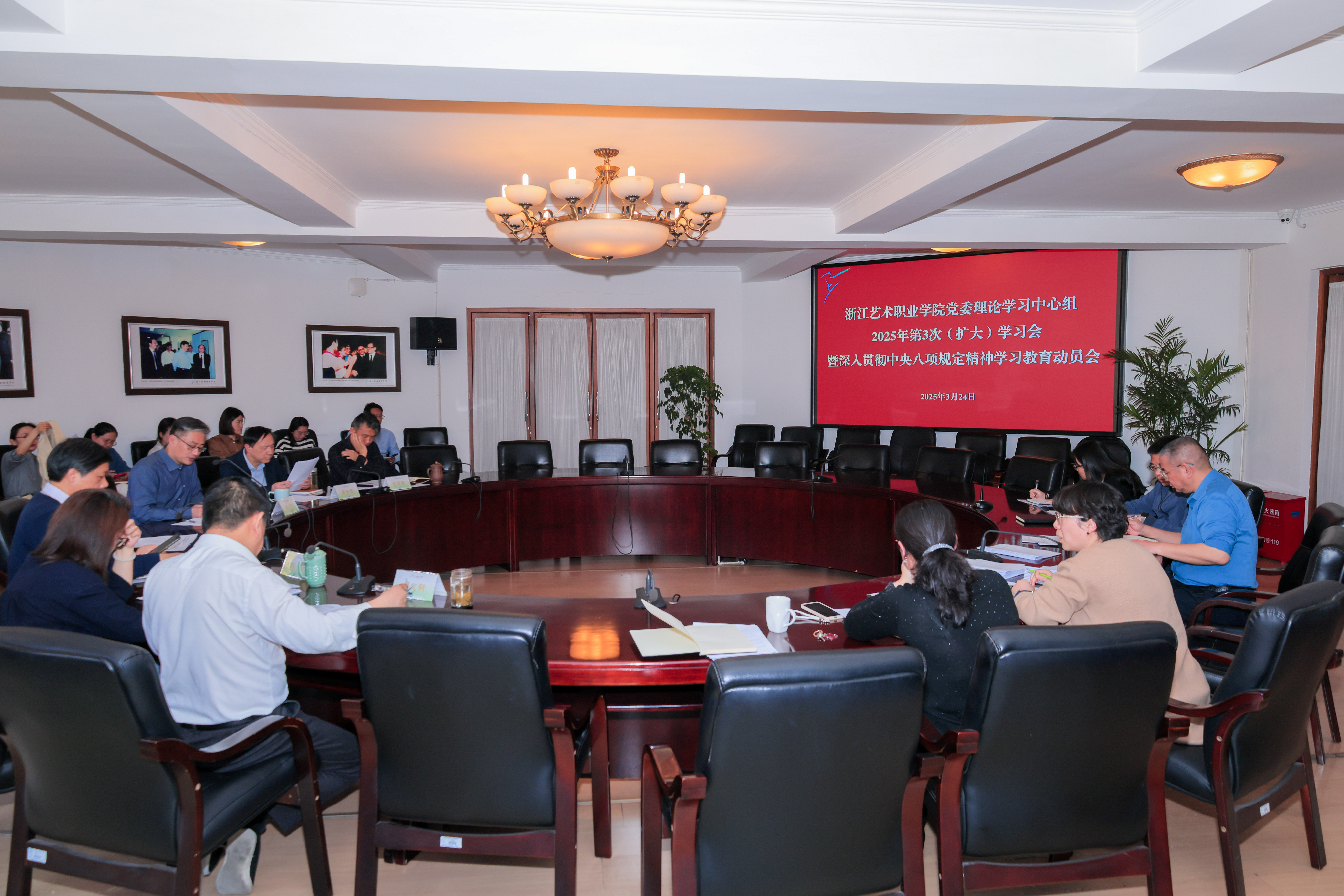 3月24日,浙江艺术职业学院召开党委理论学习中心组(扩大)学习会,传达学习中央党的建设工作领导小组、省委党的建设工作领导小组有关会议精神和《中共中央办公厅关于在全党开展深入贯彻中央八项规定精神学习教育的通知》以及省委、省委教育工委相关工作要求,审议通过《中共浙江艺术职业学院委员会关于开展深入贯彻中央八项规定精神学习教育的实施方案》,在全校正式启动深入贯彻中央八项规定精神学习教育。