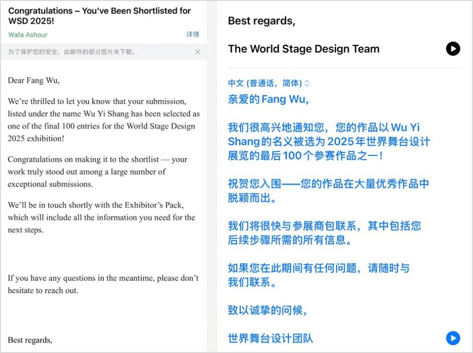 2025年世界舞台设计展将于2025年10月在阿拉伯联合酋长国沙迦表演艺术学院举办。届时,吴放的《舞衣裳》舞台设计模型、视频等作品将亮相展览。