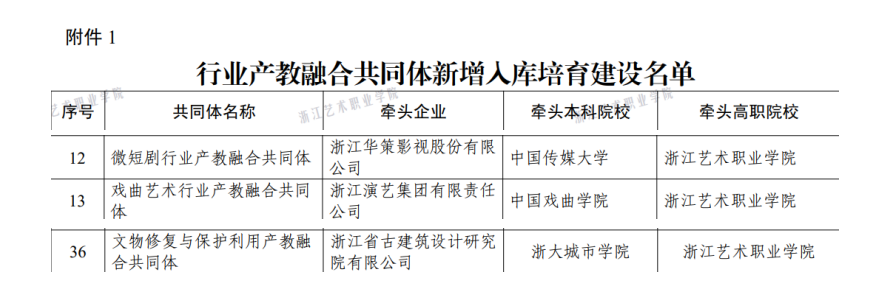 近日,浙江省教育厅公布了2025年度产教紧密融合新型平台名单。我校以牵头高职院校身份申报的微短剧、戏曲艺术、文物修复与保护利用三个行业产教融合共同体,成功入选浙江省行业产教融合共同体新增入库培育建设项目。