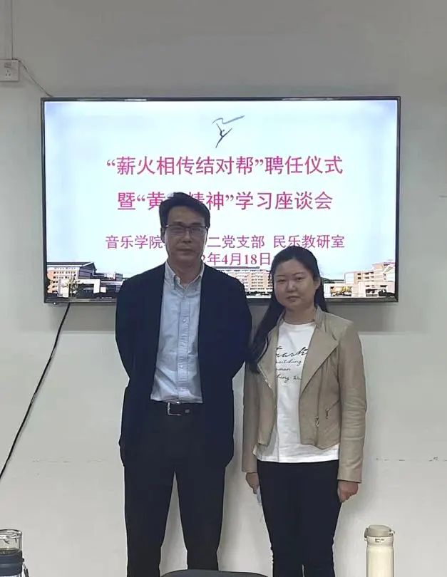 4月18日,音乐学院教工第二党支部、民乐教研室在3101党员之家举行“薪火相传结对帮”聘任仪式暨“黄龙精神”交流分享。吴樟华、朱学富、陆曙鸣、马崊等4位正高职称党员教师受聘结对4名青年教师,并作“黄龙精神”与教书育人心得分享。支部党员、民乐教研室全体教师参加。