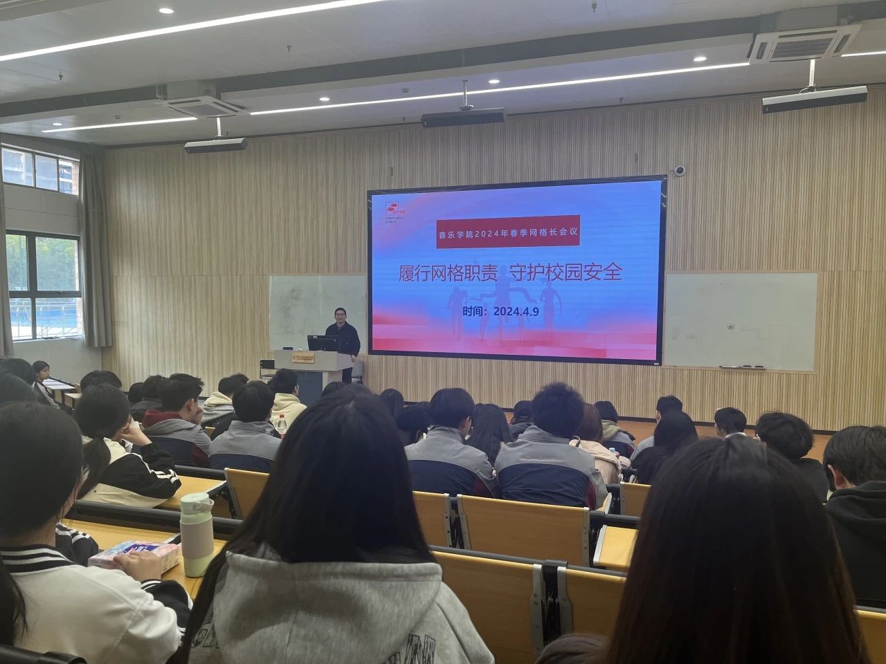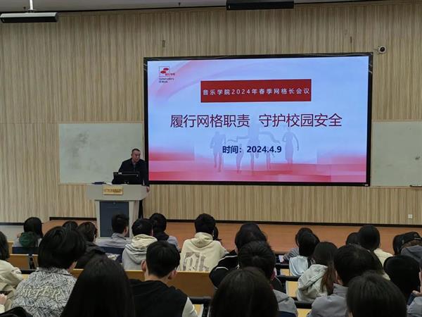 为进一步加强学院学生网格长队伍建设,增强学生网格员队伍的凝聚力、向心力,充分发挥学院网格化工作齐抓共管、共建共享效用。4月9日,音乐学院在阶梯一教室召开2024年春季学生网格长会议,本次会议的主题为“履行网格职责,守护校园安全”。学院党总支书记陈毅、副书记刘梦伟、辅导员和学生网格长参加本次会议。