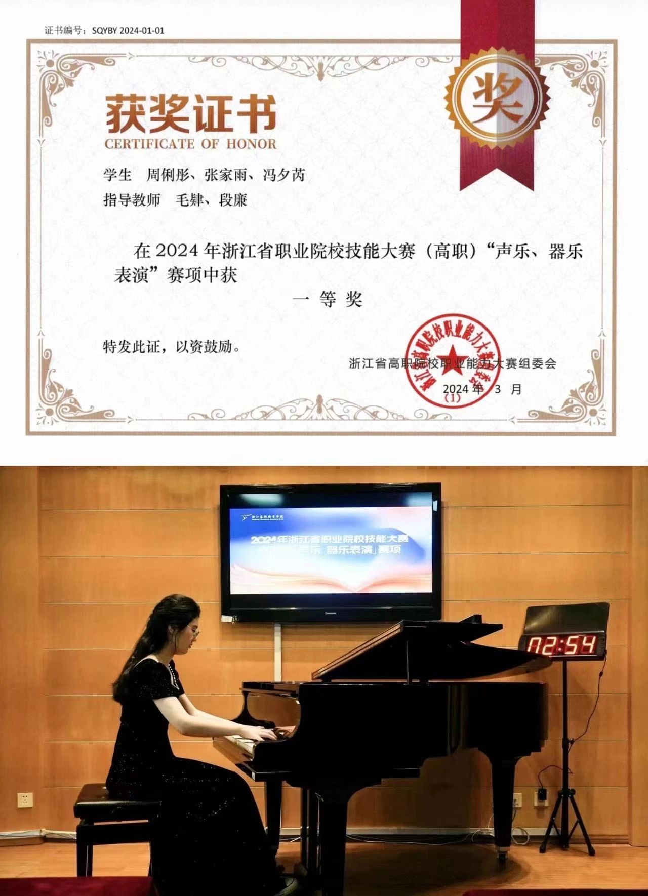 开学之初,班主任指导每位同学制定个人计划,随后整理成班级大课表,借此督促同学们逐渐养成良好习惯,提升专业技能,并做好个人规划。在校期间,班级开展个人钢琴独奏音乐会并积极参加校内外钢琴比赛,荣获浙江省技能大赛团体一等奖,键盘组第一名,多人多次荣获优秀干部、三好学生荣誉称号,班级同学荣获学校特等奖学金、一等奖学金、单项奖学金等累计达50多项,获省级及以上奖项近30余项,每位同学获专业类奖项2到5项,国际赛事奖项10项,金奖及特等奖累计11项,其中不乏日本大坂国际艺术节比赛金奖、肖邦国际青少年钢琴比赛金奖等重量级奖项。